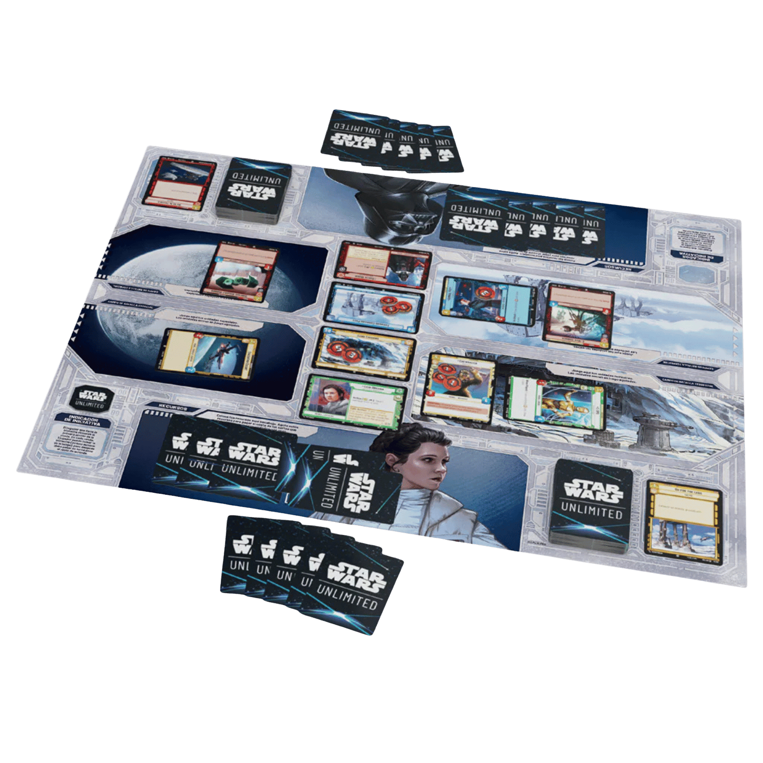 It’s not just the decks that are designed to help you learn; even the game board is built for this purpose! Star Wars: Unlimited has a number of different play zones that see use throughout the game, most notably the ground arena, the space arena, and each player’s resource area. The game board in Intro Battle: Hoth clearly lays out each of these zones for you, along with brief reminders to help you facilitate your game. (Even once you’ve learned how to play the game, you’ll want to keep using the board just so you can enjoy the stunning Hoth-themed artwork!)
